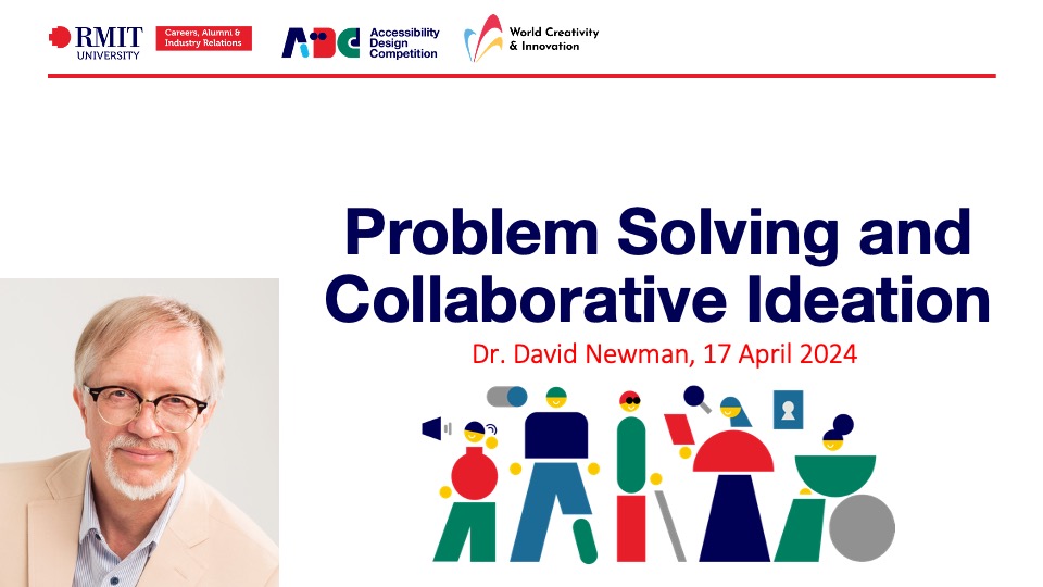 Online introduction to the problem identification and ideation process, as part of the Accessibility Design Competition organized by RMIT University. This is targeted towards student teams participating in the competition.