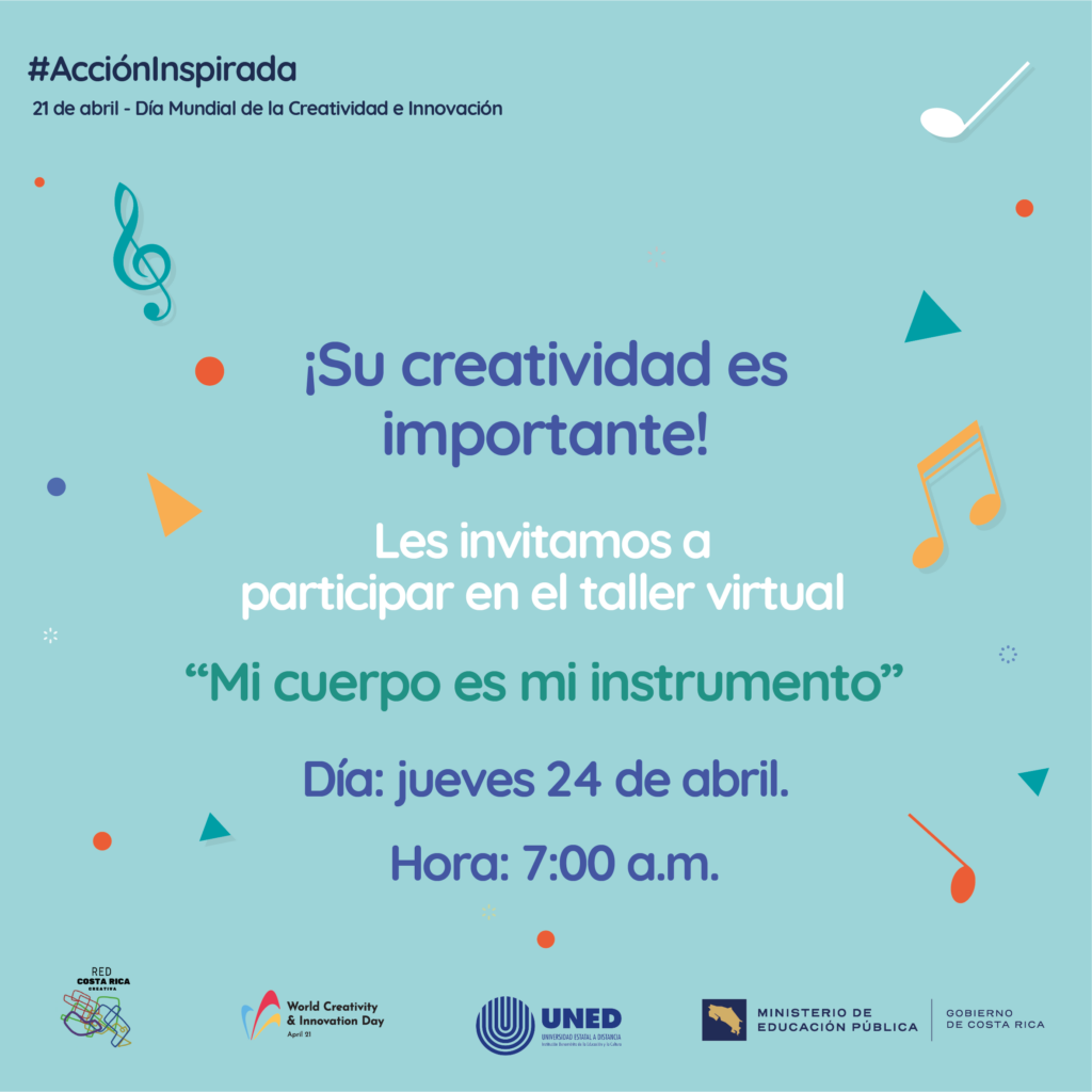 Actividad coordinada por del Ministerio de Educación Pública (MEP), la Universidad Estatal a Distancia(UNED) y la Red Costa Rica Creativa, donde se realizará un Taller sobre música y baile.