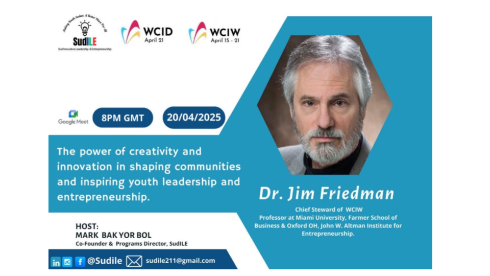 Join host Mark Bak Yor Bol, Co-Founder and Programs Director of SudILE, as he talks with Dr. Jim Friedman of Miami University (Ohio, USA) about creativity and innovation, how they can shape communities and help young people become leaders in business and beyond.