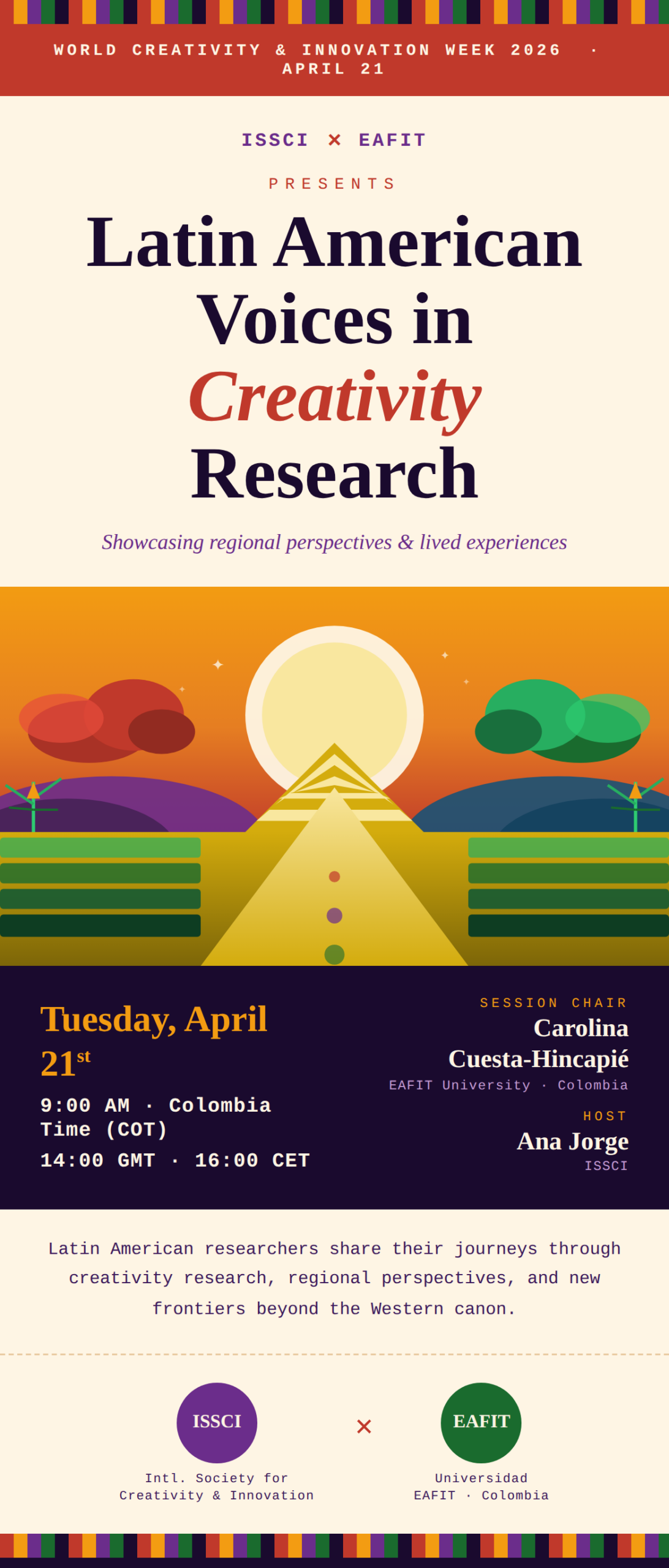 The Colombian company IKU S.A.S in association with the Somos Pileros Foundation will carry out the 5th version of the World Week of Creativity and Innovation (SemanaCI), on April 20 and 21, 2021 virtually. On the 1st day, we will have an OPEN LATAM with the participation of 10 countries co-creating around Creativity and Innovation. On the 2nd day, we will focus on SDG # 4 “Quality Education”. We will have prominent speakers such as Michael Gelb, writer of an International Bestseller, John Fitzgerald Cabra, author of creativity and professor at N.Y, representatives from MIT, and other important actors. We will pay a posthumous tribute to the Honorable Sir. Ken Robinson, and we will have two panels that write down the foundations for the construction of a manifesto to rethink education. SemanaCI, everyone’s week!