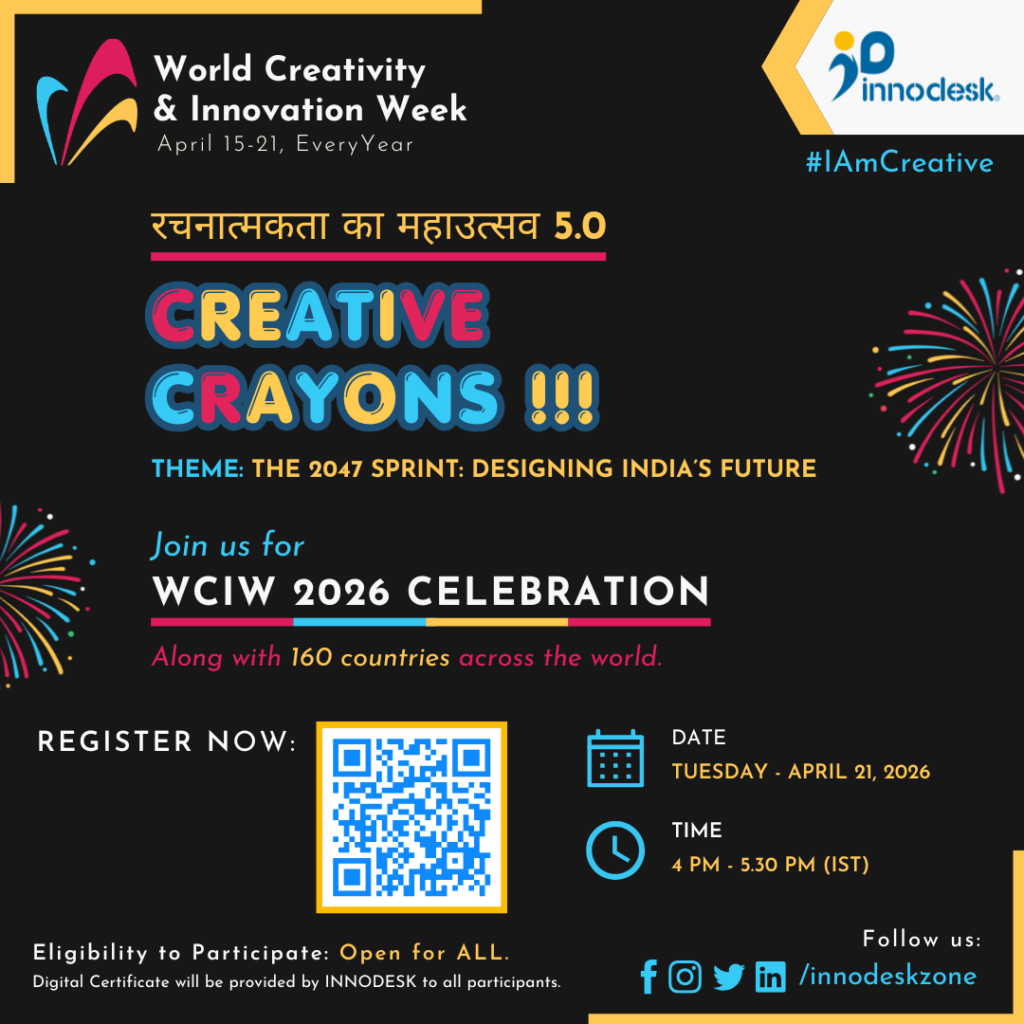 This World Creativity & Innovation Day, Innodesk is turning the spotlight on the most powerful resource we have: “The Indian Mind”. Creative Crayons 5.0 is more than a workshop; it’s a national celebration aligned with the Viksit Bharat 2047 mission. We are gathering curious minds from all walks of life to spend 90 minutes solving real-world challenges through “Design-driven Innovative Thinking”. No theories, no lectures—just pure, hands-on creative tools to help build a self-reliant India. Let’s stop being spectators of the future and start being its architects.