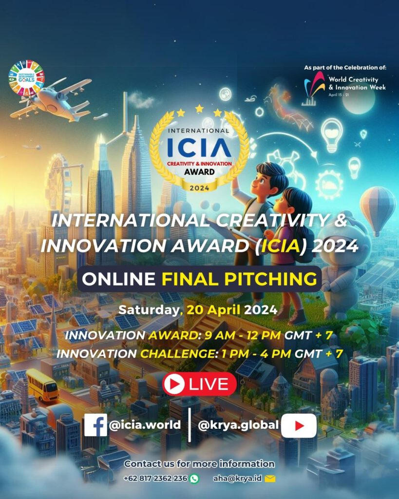 The Online Final Pitching for Innovation Challenge 2024 and Innovation Award 2024 for ICIA 2024 is a virtual event where participants present their innovative solutions and projects. Scheduled for Saturday, 20 April 2024, from 9 AM to 4 PM GMT+7, it will be live-streamed on YouTube (@krya.global) and Facebook (@icia.world).