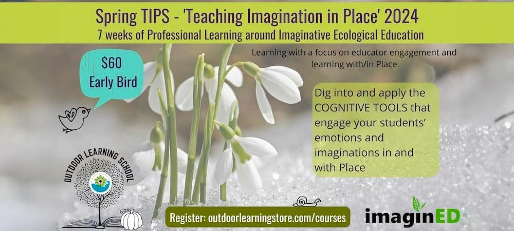 The Spring TIPS (Teaching Imagination in Place) program supports educators in using tools of imagination to investigate their understandings of imagination, Place, and outdoor learning. Asynchronous self-paced study is paired with weekly online community building and sharing. Join us to learn how to take learning outside with imagination and inquiry!