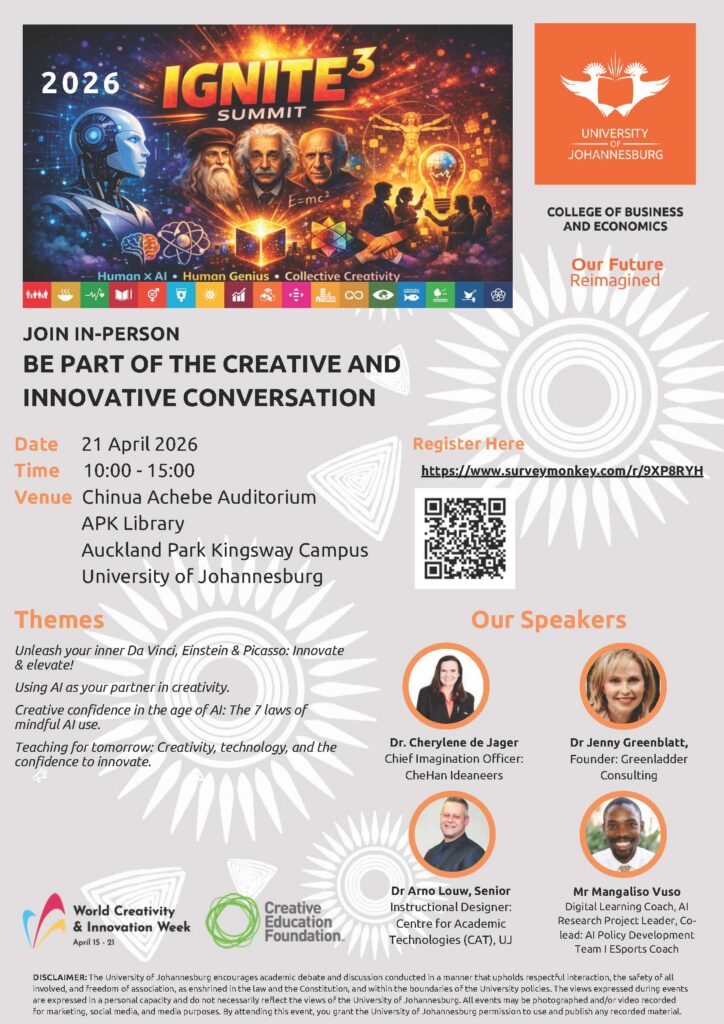 This in-person event will feature four facilitators and a performance by the Joburg Theatre. Session 1: Unleash your Inner Da Vinci, Einstein & Picasso: Innovate & Elevate! Facilitator: Dr. Cherylene de Jager. This masterclass introduces Creative Intelligence (CQ) as a critical capability for navigating the Fourth Industrial Revolution. Participants will explore how to apply structured creativity tools and frameworks to drive innovation, build partnerships between education and industry, and address real-world challenges. Session 2: Using AI as your Partner in Creativity. Facilitator: Dr Jennifer Greenblatt. This session reframes AI as a collaborative thinking partner rather than a competitor. Participants will learn how AI can enhance problem-solving, ideation, and action planning—unlocking deeper levels of creativity while maintaining human ownership of ideas. Session 3: Creative Confidence in the Age of AI: The 7 Laws of Mindful AI Use. Facilitator: Dr Arno Louw. An engaging exploration of how to use AI responsibly and creatively. This session introduces the 7 Laws of Mindful AI Use, equipping participants with tools to strengthen reflection, judgement, and innovation in an AI-driven world. This session is not to be missed! Remember to register.